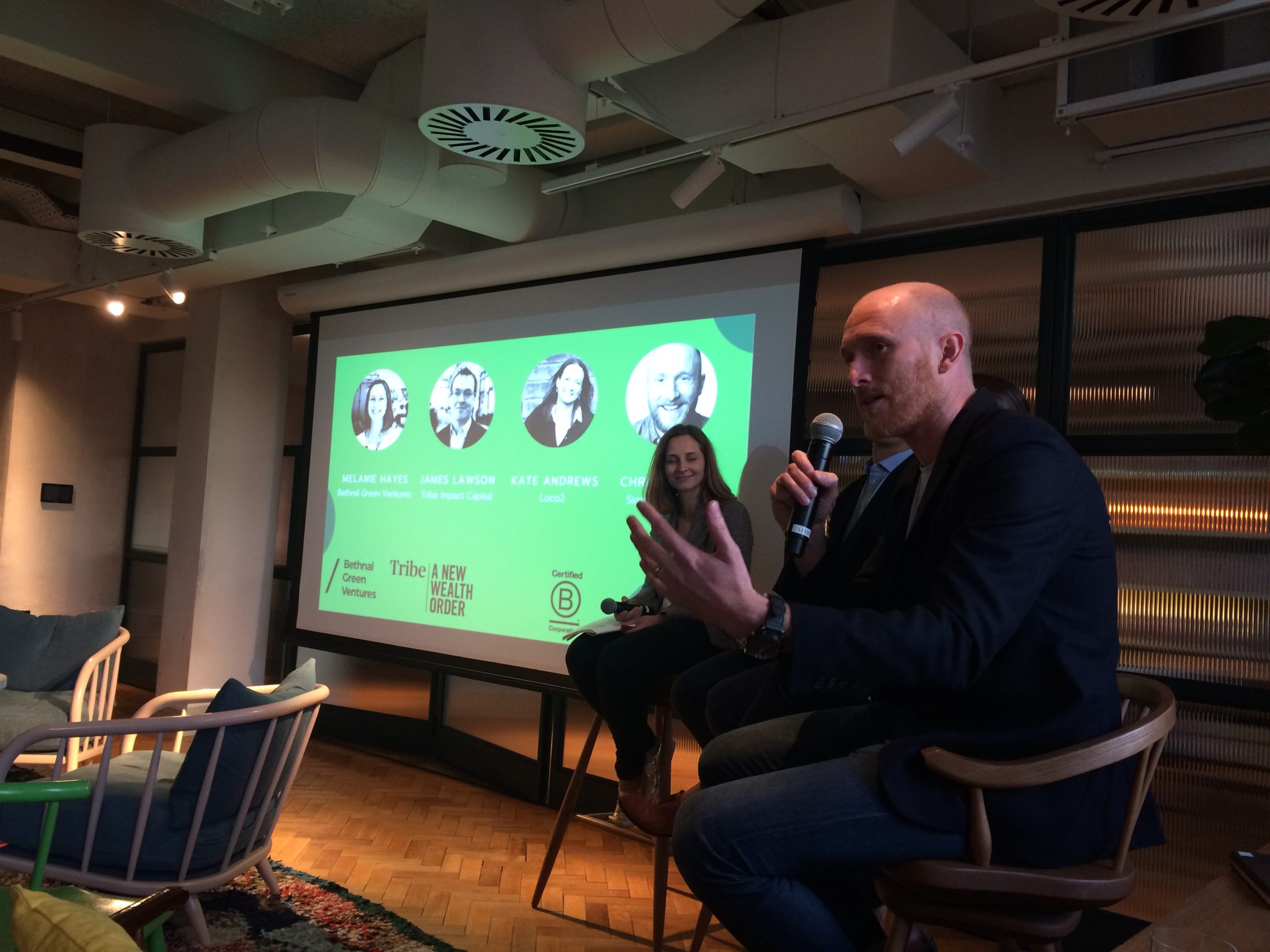 To hear first hand about the journey of founder investor, we invited three fantastic speakers – Chris Slater co-founder of Simply Business , Kmiate Andrews co-founder of Loco2 and James Lawson co-founder of Ledbury Research, to share their unique stories on the journey of founder to investor, and their views on how to do good on exit.